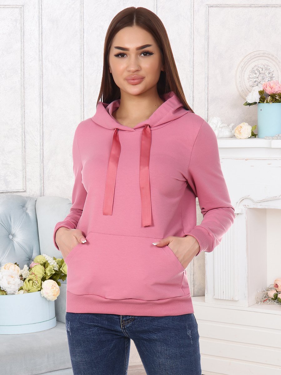 Джемпер женский с женским рукавом, с капюшоном и карманом кенгуру. Манжеты и пояс из кашкорсе, капюшон с декоративными лентами.