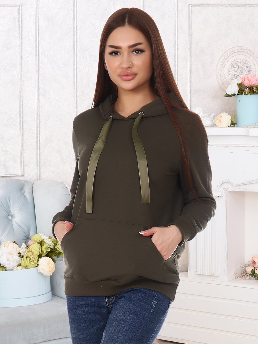 Джемпер женский с женским рукавом, с капюшоном и карманом кенгуру. Манжеты и пояс из кашкорсе, капюшон с декоративными лентами.