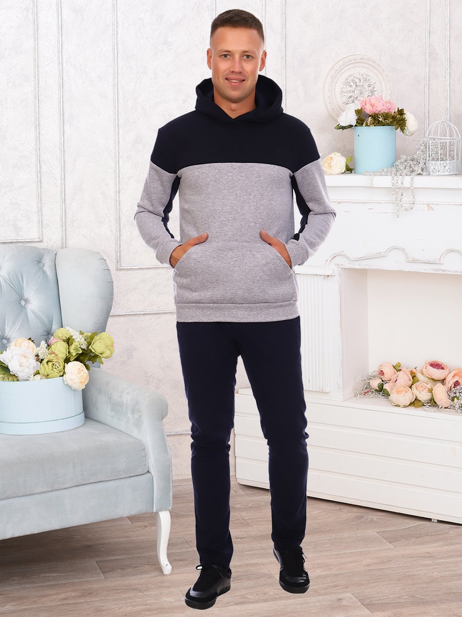 Толстовка с двойным капюшоном, с длинным разрезным рукавом, кокетками спереди и на спинке. На детали переда накладной карман-кенгуру. Манжеты рукавов и пояс толстовки из кашкорсе.