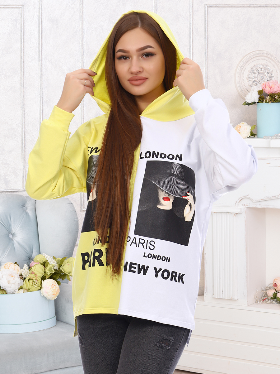 Толстовка женская со спущенным плечом, втачным длинным рукавом на манжете, с капюшоном. На детали переда печать.