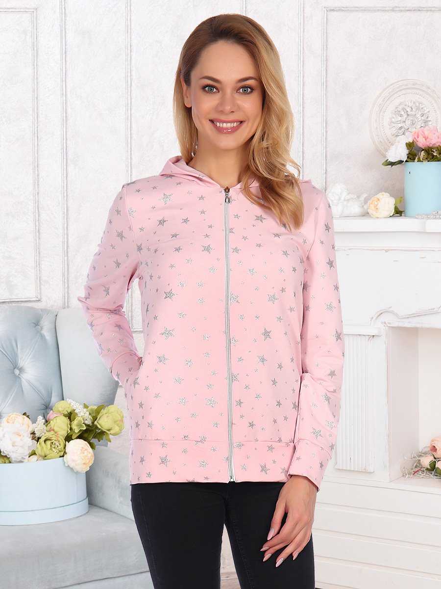 Толстовка женская с втачным длинным рукавом на манжете, с капюшоном, застежкой на тесьму-молнию. На детали переда карман. По низу изделия притачной пояс.