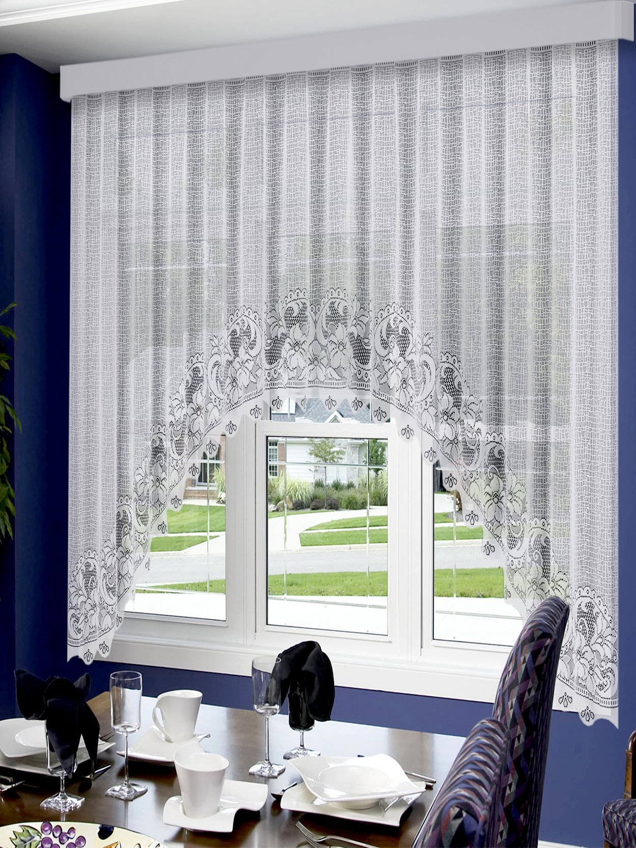 Гардина для кухни, кухни-столовой, студии-кухни из жаккардового тюле гардинного полотна белого цвета, с оригинальным плетением полотна, и арочным краем гардины с цветочным рисунком по краю арки, ширина гардины 350 см. высота 180 см., крепление зажимы для штор(крокодильчики), в комплект не входят.