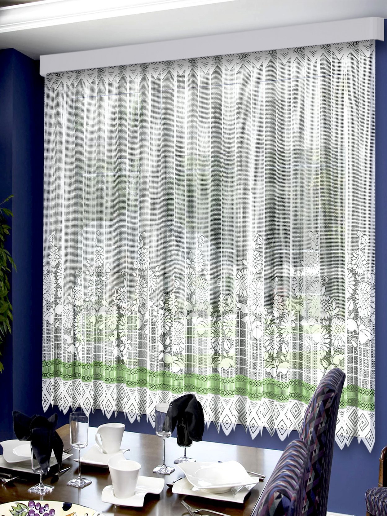 Гардина из жаккардового тюле-гардинного полотна белого цвета, с плотным однотонным рисунком по всему полотну, и зеленой отделкой края гардины, жаккардовой каймой, шириной 400 см. высотой 175 см., крепление зажимы для штор(крокодильчики), в комплект не входят.