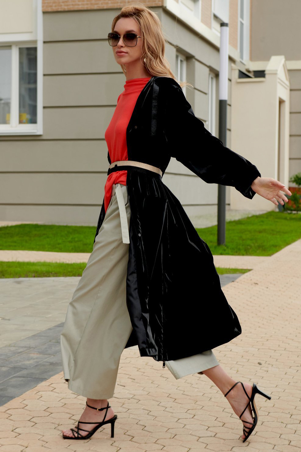 Свободный плащ А-силуэта со спущенной линией плеча, широкими рукавами и прорезными карманами на молнии, а также с капюшоном и дополнен поясом из эластичной резинки на двух пробивных кнопках. Плащ выполнен из латексной ткани и дополнен деталями в виде шлиц с молниями по бокам. В таком плаще вы не останетесь незамеченной, а свободный крой позволит комбинировать его с любыми образами.