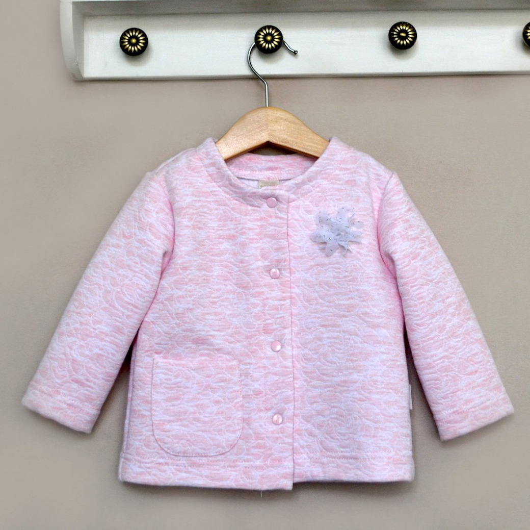 Элегантный жакет с карманом для малышки, выполненный из мягкого меланжевого капитона с красивой стёжкой "розы". Центральная застежка на кнопках. Украшен цветком.