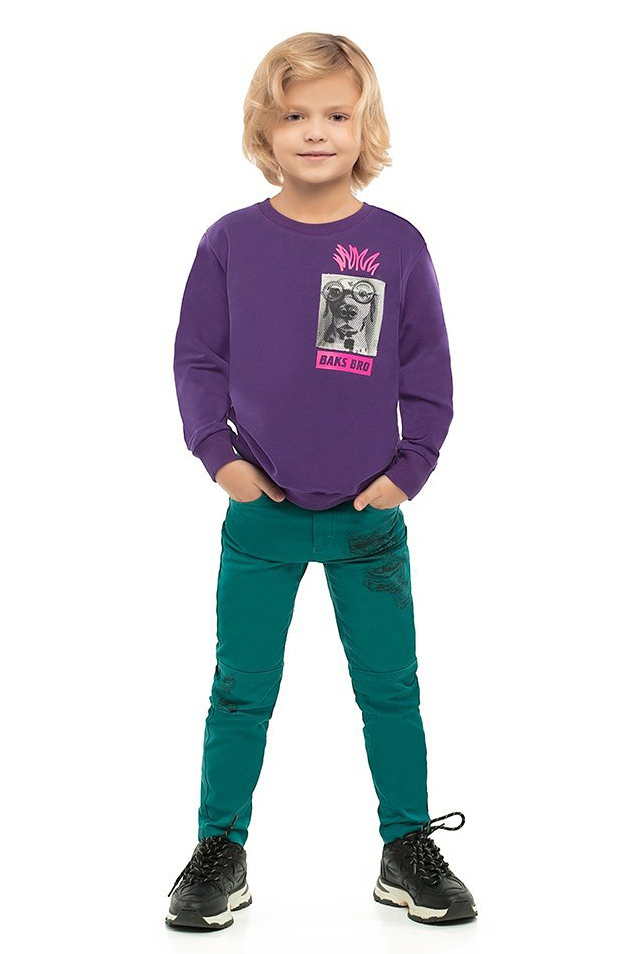 Джемпер для мальчика цвета баклажан. Манжеты, воротник и низ из рибаны. Принт в стилистике капсулы «Дружище бакс».