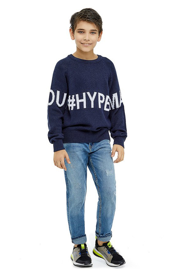 Стильный вязаный джемпер модного денимного цвета отлично дополнит любой casual образ. Комфортный силуэт и надписи в уличном стиле делают его особенно актуальным для современного мальчика. Яркий, модный дизайн делает джемпер запоминающимся и оригинальным