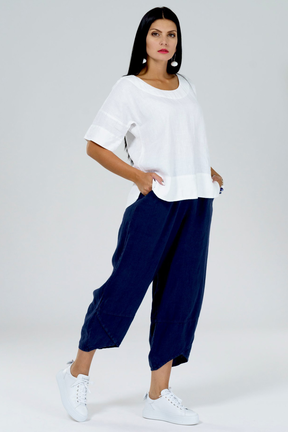 Хит продаж! Льняные брюки в стиле "спорт шик". Брюки дополнены карманами и резинкой по задней части пояса. Брюки выполнены изо льна плотностью 185 g/m2, благодаря чему ткань не просвечивается даже в самых светлых оттенках. Не стоит опасаться, что в изделиях изо льна средней плотности вам будет жарко летним днем. Такой лен отлично отводит влагу в теплые дни и согревает прохладными летними вечерами. Смягчение льняных изделий Deja Fashion производиться при температуре 90 градусов по технологии “STONE WASH”. Благодаря этой технологии цвет изделий остается неизменным после многократных стирок, гарантировано не дает усадки, а легкий эффект «помятости» ткани придает изделию неповторимый шик. Состав: 100% умягченный лен, материал имеет сертификат European Flax и OEKO-TEX. Внимание! Изделие большемерит, выбирайте на один размер меньше вам привычного.