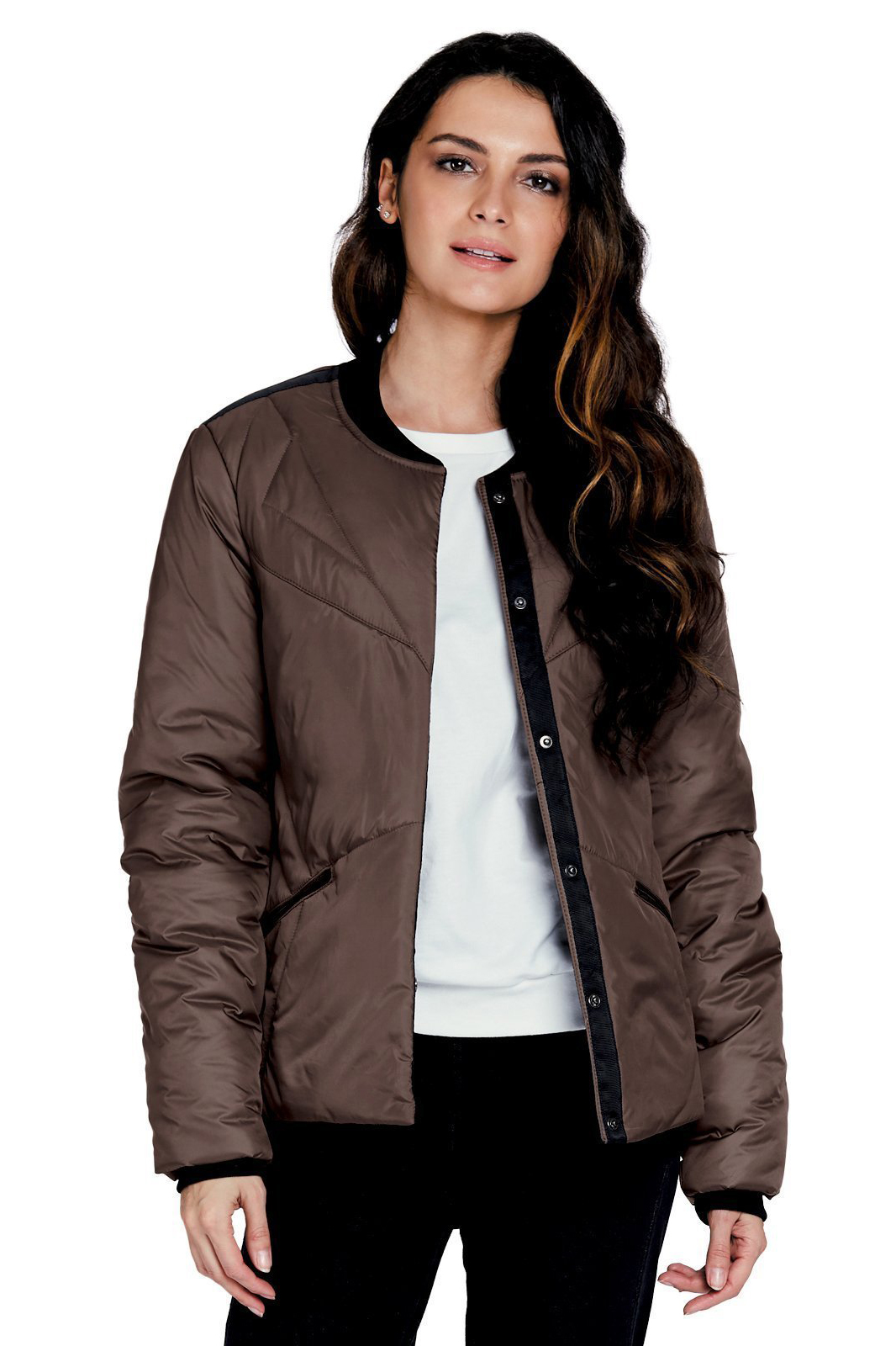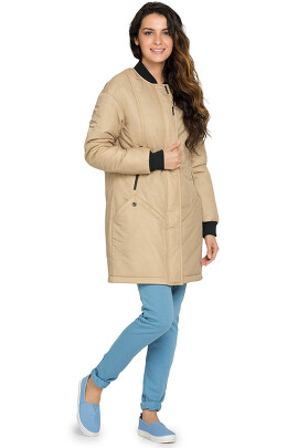 Стильная утеплённая куртка в спортивном стиле с трикотажным воротом и манжетами. Застежка на потайных кнопках украшена оригинальной декоративной тесьмой. Удлиненная спинка изделия подарит вам дополнительный комфорт в прохладную погоду.