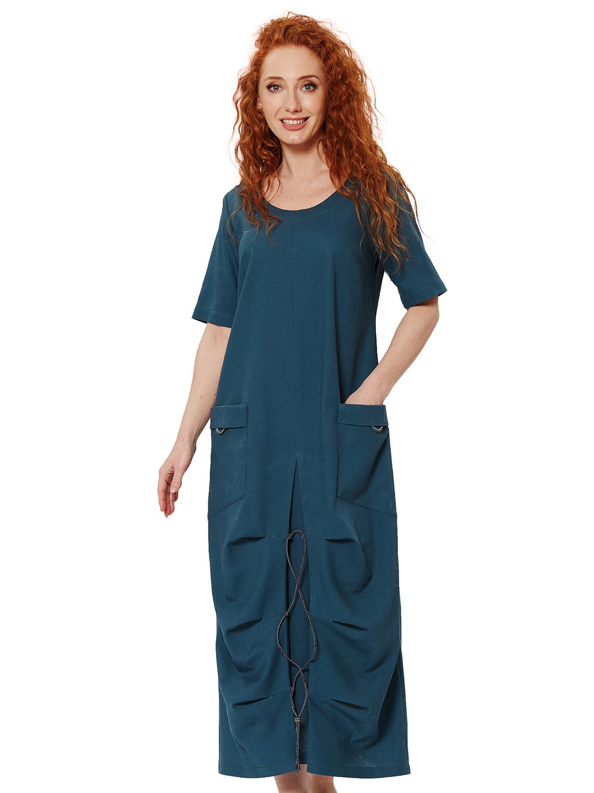 Женственное платье полупрлегающего силуэта с накладными карманами, отделкой по переду декоративной шнуровкой и оригинальными защипами из натуральной смесовой ткани российского производства бренда D'imma.