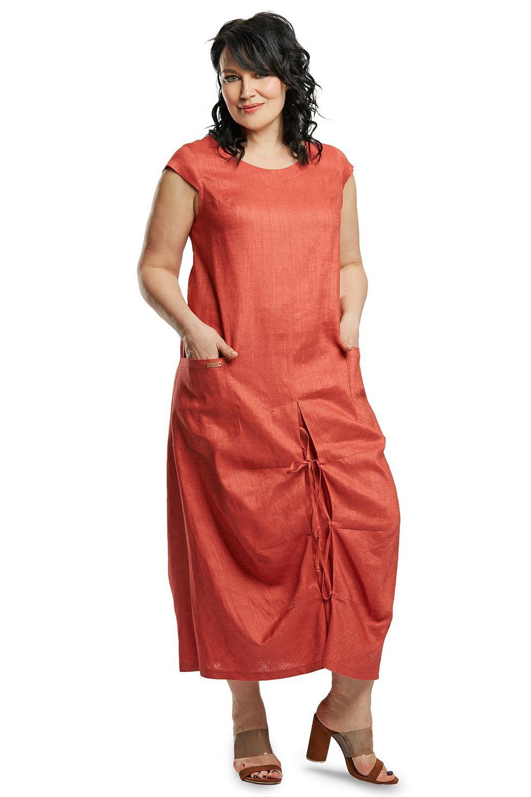 Удлинённое льняное платье с рукавом «японка», интересными прорезными карманами и декоративной кулиской.