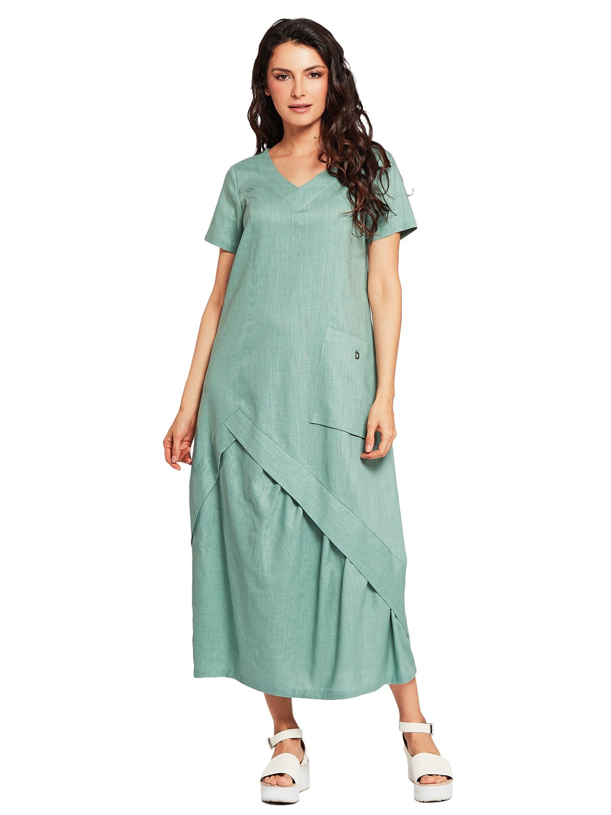 Удлинённое льняное платье с коротким рукавом, V-образным вырезом и большими накладными карманами. По низу платье декорированно диагональными складками.