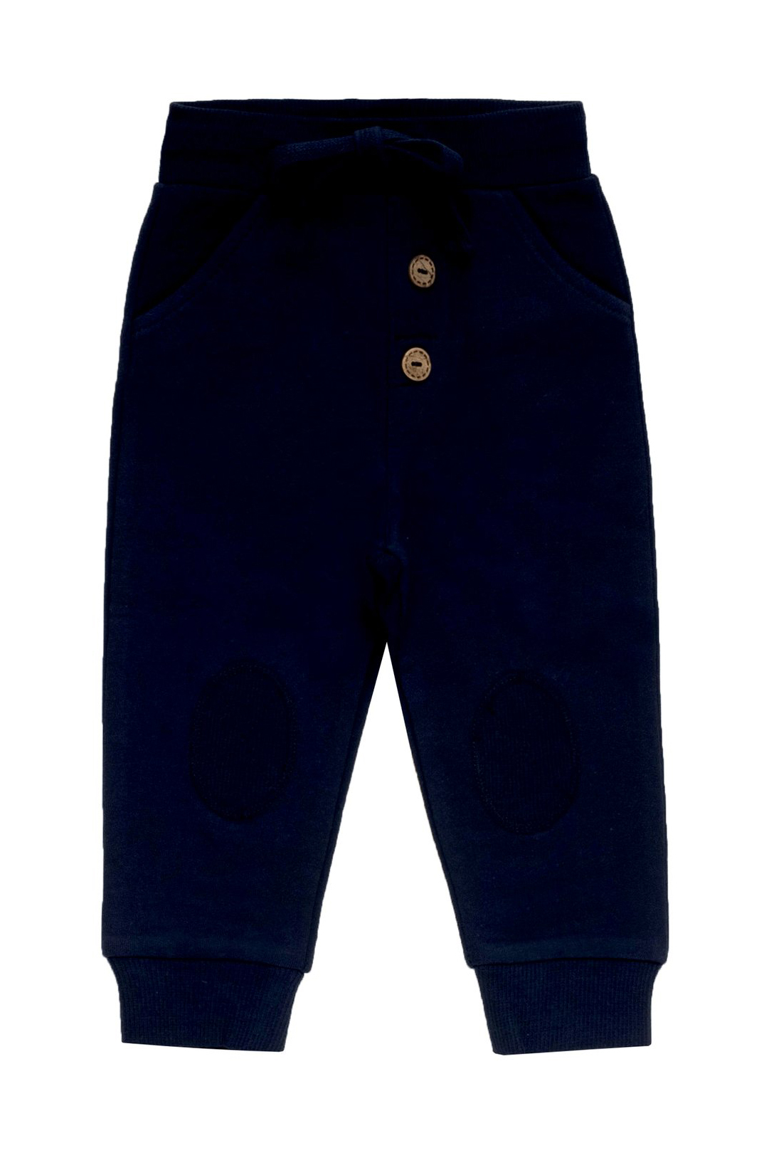 Брюки для мальчика спортивного стиля с 2-мя карманами из футера. Пояс на кулирке. На коленях-имитация заплаток. Детали: две пуговицы-обманки.