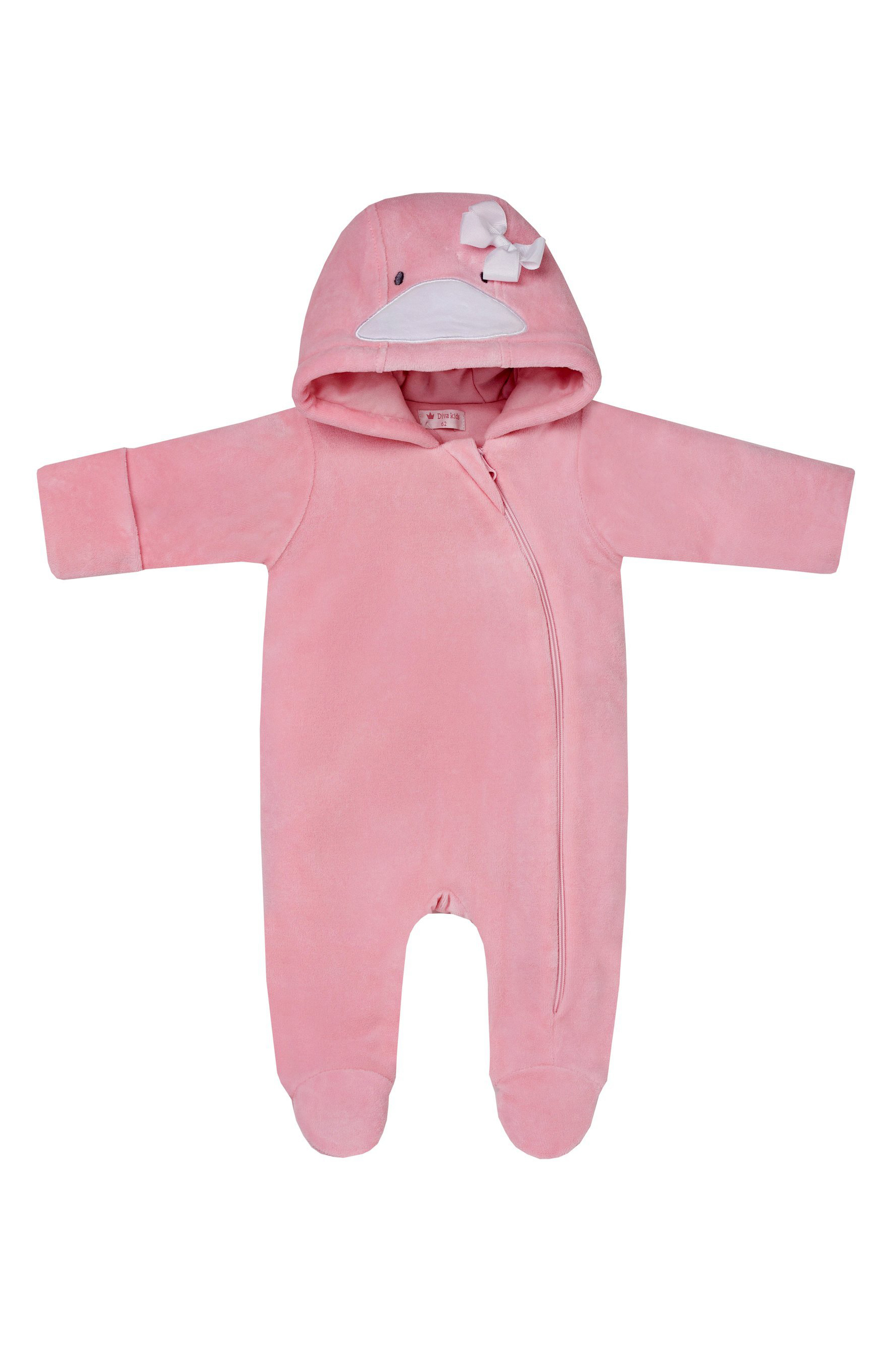 Комбинезон для девочек из велюра на синтепоне розового цвета с капюшончиком и аппликацией в виде крылышек сзади. На размерах 56, 62,68 ножки закрыты и на рукавах-антицарапки. На размерах 74, 80 ножки открыты, рукав-розовая резинка. Температурный режим до +10° C.