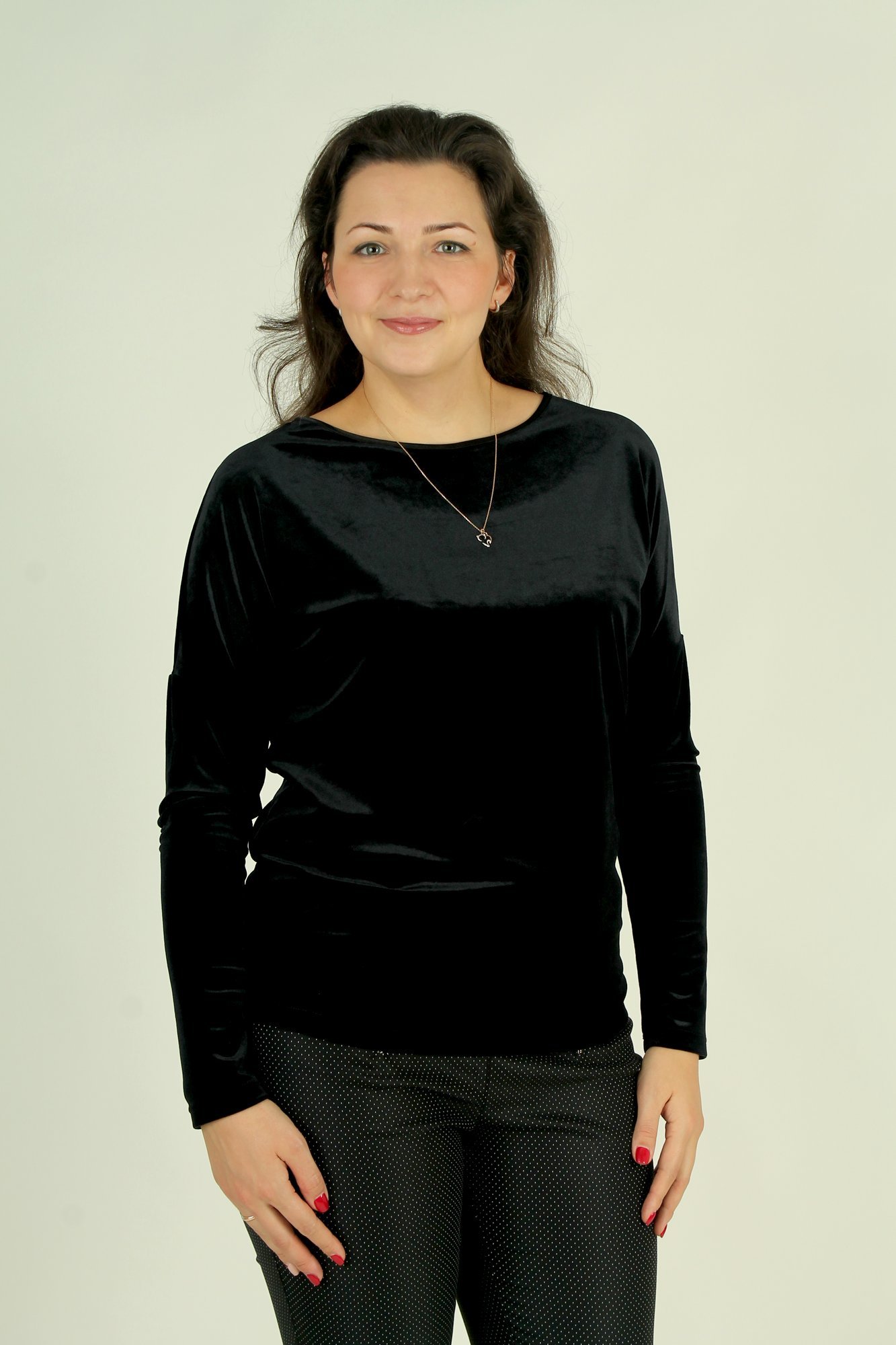 - Блузка из трикотажного бархата со спущенным плечом и длинными рукавами.