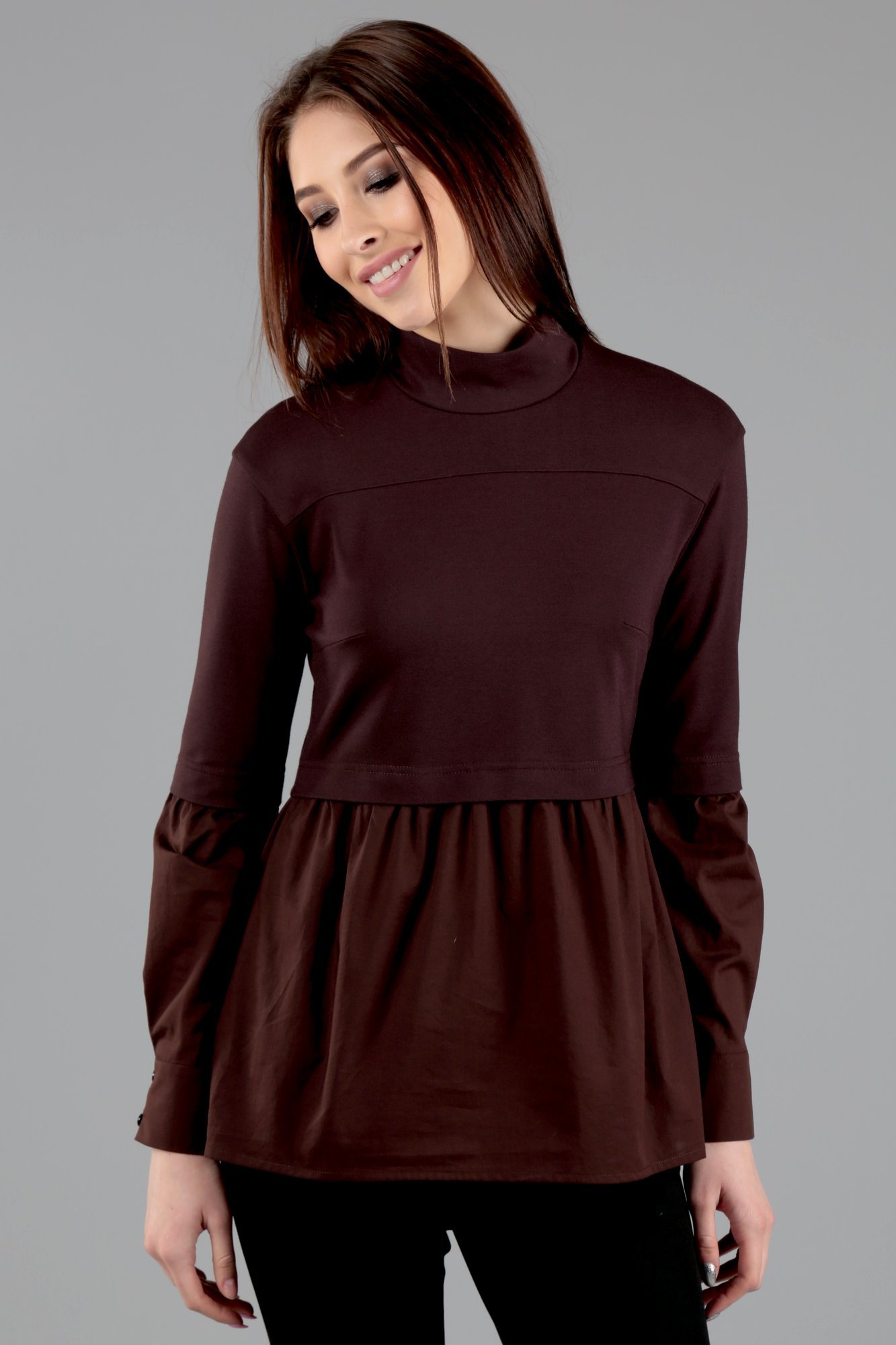 Отрезная по линии талии стильная кофточка из плотного трикотажа и высококачественного хлопка. Спущенное плечо, небольшая сборка, воротник-стойка с застежкой на пуговицы сзади, рукава на манжете — отличный способ разнообразить осенне-зимний гардероб.