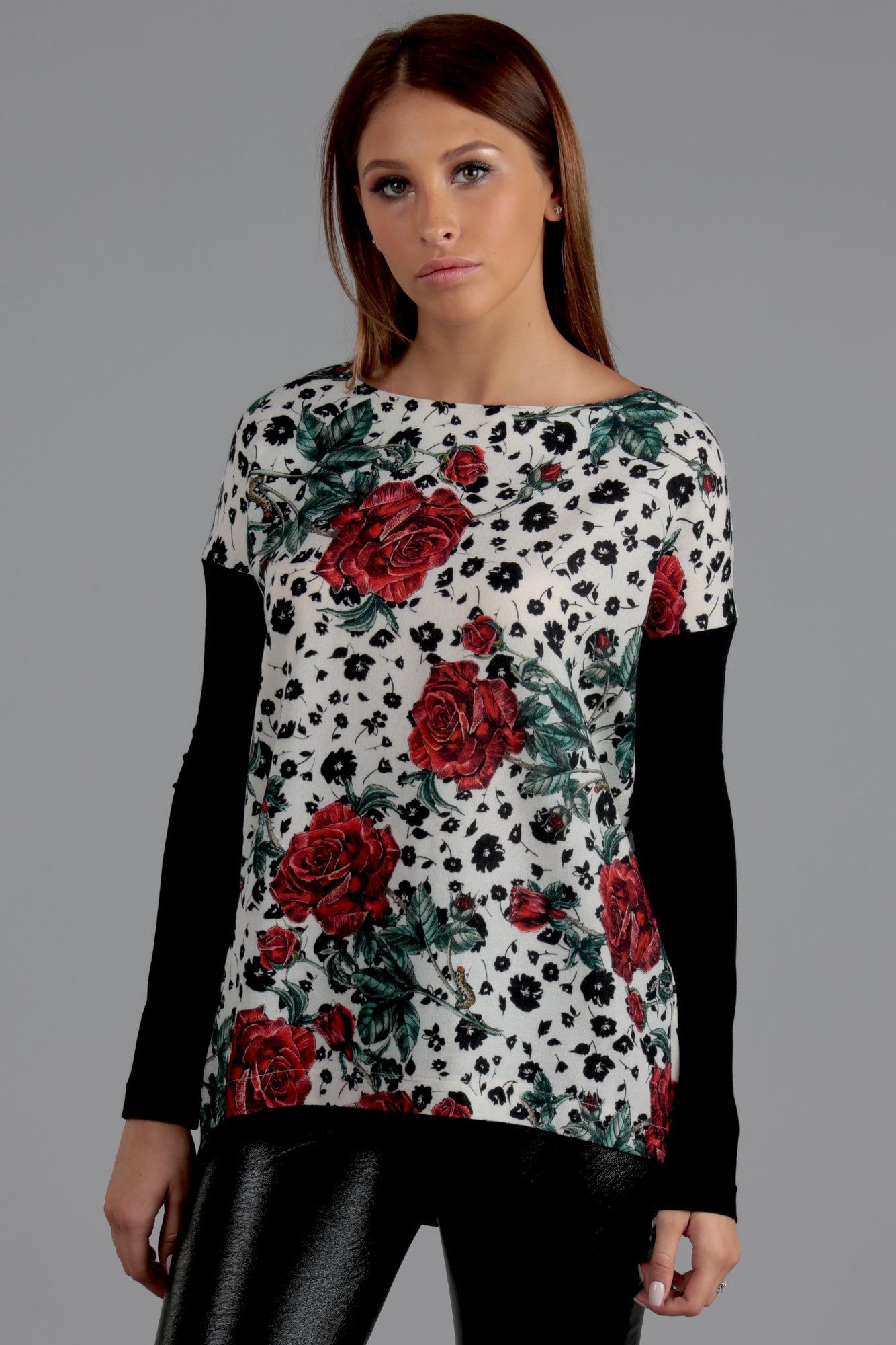 Эффектная кофточка с модным цветочный принтом. Силуэт прямой, свободный. "Спущенное" плечо — стильное оформление линии плеча. Длинный рукав из трикотажного полотна, разноуровневый низ. Эта стильная и комфортная вещь подойдет как для повседневной носки, так и для особого случая. Параметры модели на фото: Рост: 177 см., ОГ: 86 см., ОТ: 62 см.