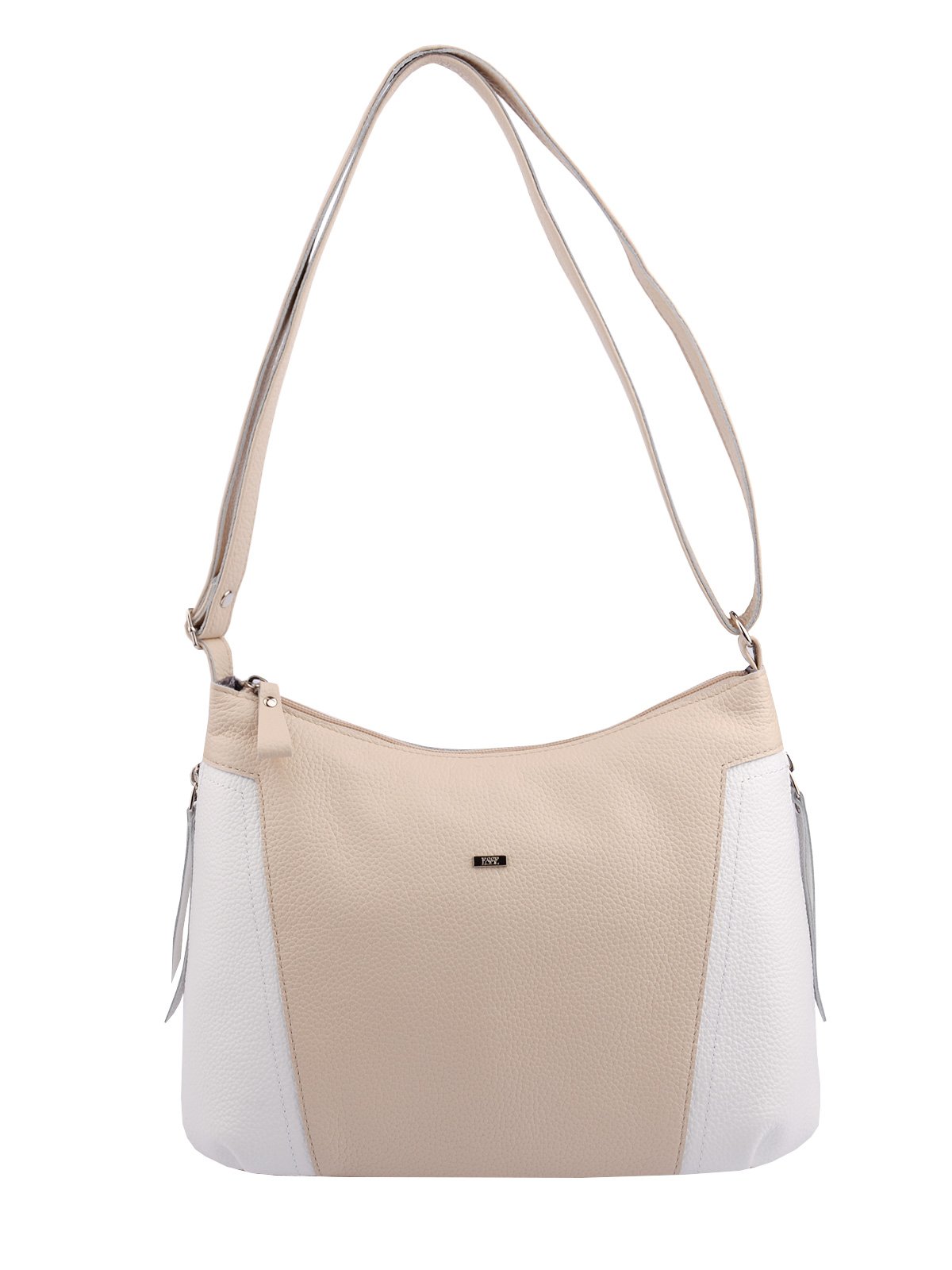 Женская сумка среднего размера для ношения через плечо. Внутри одно отделение, карман на молнии и открытый карман. Сзади снаружи так же карман на молнии. По бокам сумки два вертикальных глубоких кармана на молниях. Длина ремня регулируется с помощью пряжки.