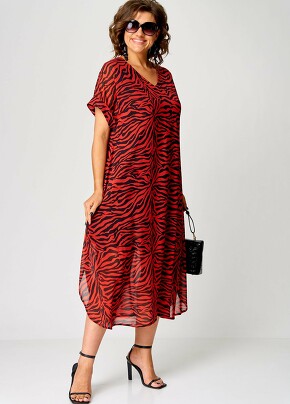 Платье женское нарядно-поседневное полуприлегающего силуэта расширенное к низу на подкладке. Выполено из шифона. Подкладка трикотажная. Вырез горловины V-образный на обтачке, рукав спущенный по низу на притачной манжете. Низ фигурный. В боковых швах обработаны разрезы. Горловина спинки с фигурным вырезом и пряжкой. декором платья служит дизайн самой ткани.