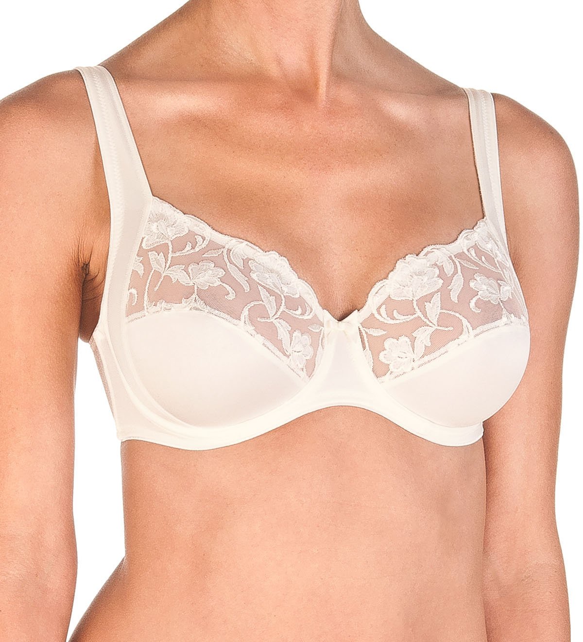 Бюстгальтер с мягкой чашкой на каркасах выполнен из мягкой блестящей микрофибры. Чашка с горизонтальным рельефом и боковым подрезом для хорошей поддержки груди. Верхняя часть чашки выполнена из вышивки на сетке с цветочным рисунком. Широкая передняя деталь украшена маленьким атласным бантиком. Боковые детали с мягкими поддерживающими косточками. Боковые подрезы чашек переходят в регулируемые бретели.