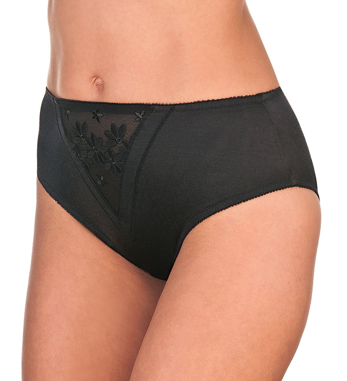 Трусы классические макси выполнены из мягкой микрофибры. Спереди по центру треугольная вставка из вышивки на сетке. Хлопковая ластовица.