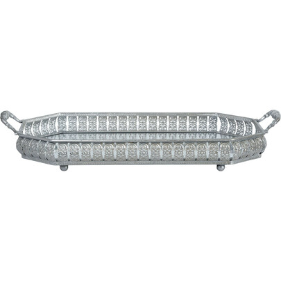 Металлический поднос с зеркальной поверхностью, резными бортами с винтажным эффектом, придаст современный вид любому столу. Изделие имеет признаки искусственного состаривания, поверхность декорирована с эффектом патинирования, а наличие сварочных фрагментов подчеркивают принадлежность к ручной работе. Сдержанный дизайн изделия станет отличным акцентом и дополнением к Вашему интерьеру. Эксклюзивные формы и фактуры навеяло богатство культуры Африки, множество художественных традиций и таинственная атмосфера, окутывающая неподражаемостью.