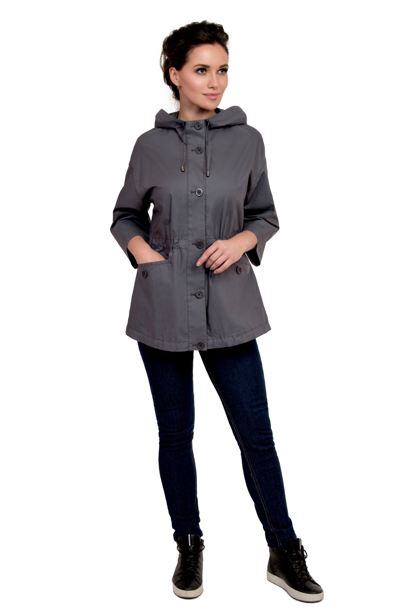 Модель из хлопкового текстиля с застежкой на пуговицы. Цельнокроеный капюшон, кулиска по линии талии и на капюшоне. Приспущенная линия плеча, рукав 3/4. Прорезные карманы с клапанами. Без подклада. Модель большемерит на размер.