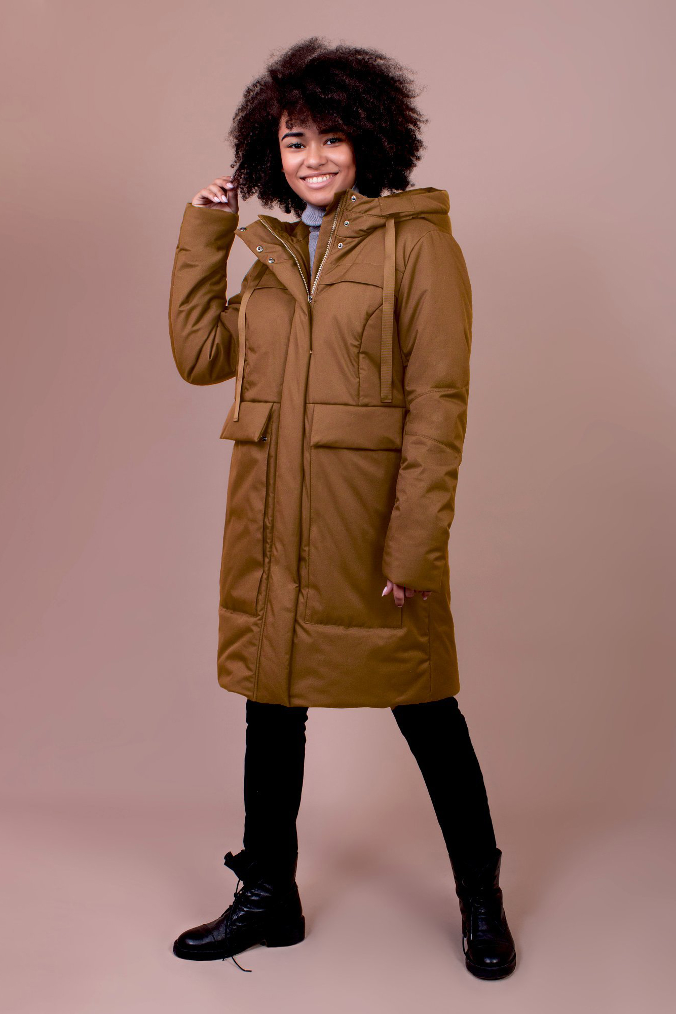 Зимнее пальто прямого силуэта. Детали: втачной рукав, несъемный капюшон, на капюшоне кулиска из репсовой ленты, накладные карманы с клапанами, трикотажные манжеты по низу рукава, центральная застежка на молнию с ветрозащитной планкой.