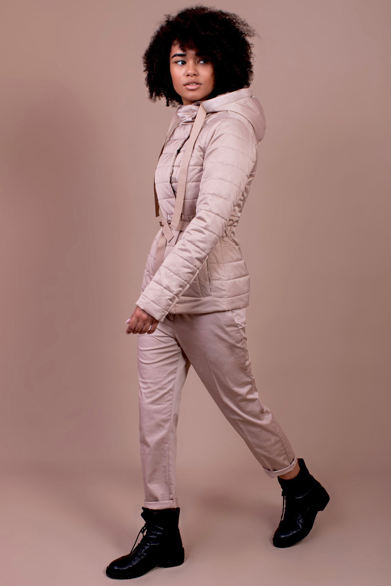 Демисезонная куртка приталенного силуэта. Изделие выполнено из стеганой плащевой ткани с ветрозащитными и водоотталкивающими свойствами. Куртку дополняют детали: центральная застежа на молнию и широкий запах на потайные кнопки; уютный капюшон с репсовой кулиской не отстегивается; кулиска из репсовой ленты по линии талии с застежкой на кольца; втачной тип рукава; длина рукава регулируется отворотом; прорезные карманы по бокам. Комфортный температурный режим ношения +5+15. Рекомендации по уходу за изделием: стирка при 30 гр; щадящий режим отжима; сушить в расправленном виде.