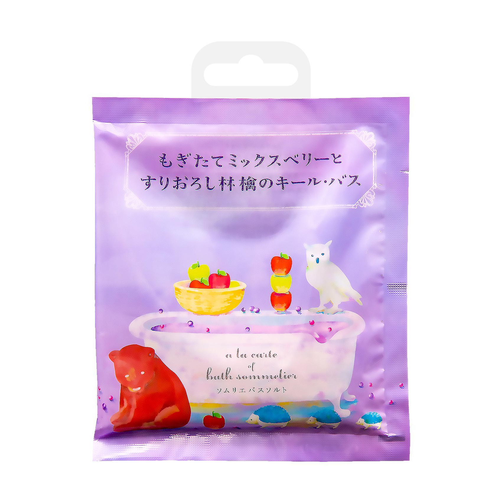 "Насладись специальным увлажняющим рецептом для ванны от маленьких японских лесных друзей. Авторы соли: сова Фукуро — ценитель яблок и папа-еж Хеджи — любитель вина ии винограда.Морская соль улучшит состояние кожи, делая её мягкой и бархатистой, и делает процесс принятия ванны замечательной антистрессовой и иммуномодулирующей процедурой. Экстракт вина, яблока, листьев черники и обагащенный витаминами виноградный сок тонизируют и укрепляют кожу, подтягивая её, стимулируя обменные процессы и выработку коллагена. Аромат свежих яблок и винограда идеально подойдет для расслабления перед сном. Придаёт воде нежный лавандовый оттенок.