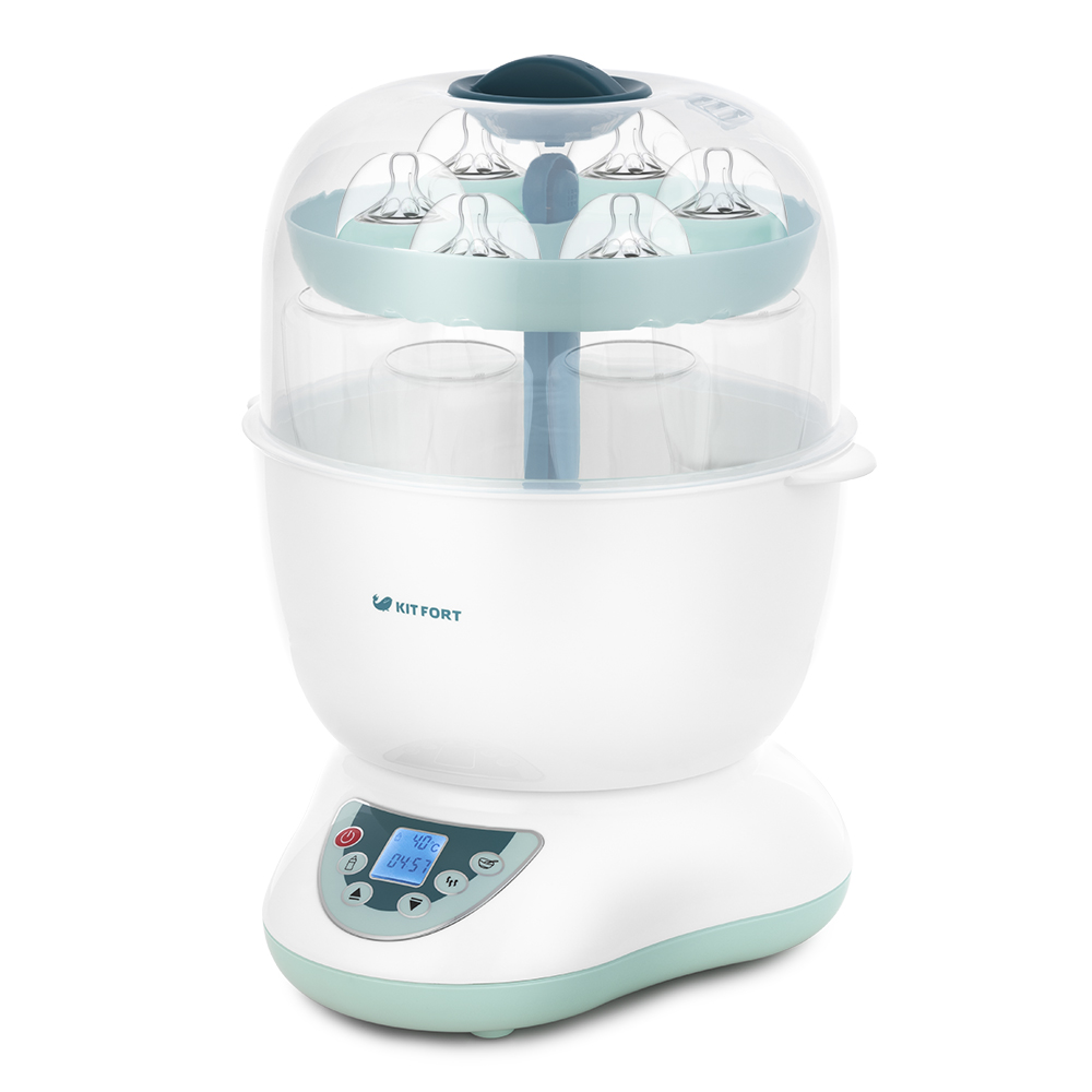 Стерилизатор Kitfort KT-2312 совмещает в себе несколько функций. Он позволяет простерилизовать бутылочки для детского питания и другие подходящие по размеру аксессуары. Бутылочки помещаются горлышками вниз на посадочные места в чаше, а соски и другие аксессуары раскладываются на поддоне, устанавливаемом сверху. Можно простерилизовать 6 бутылочек за раз. По окончании стерилизации прибор автоматически выключается. Мощность 500 Вт,