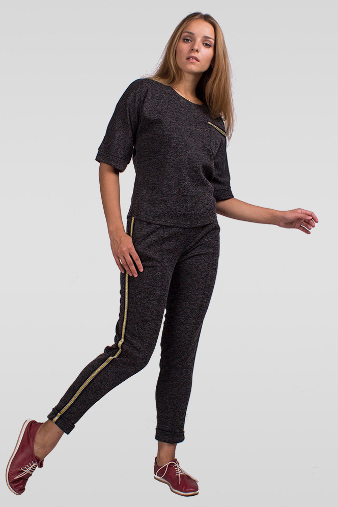 Костюм из трикотажа меланж состоит из брюк со стрелками, лампасами из тесьмы декоративной, с о воротами по низу и пояс на резинке, и блузки с цельнокроенным рукавом с манжетой, с карманом отделанным тесьмой на груди. Длина блузки 56 см 42 р-р, длина брюк 100 см.