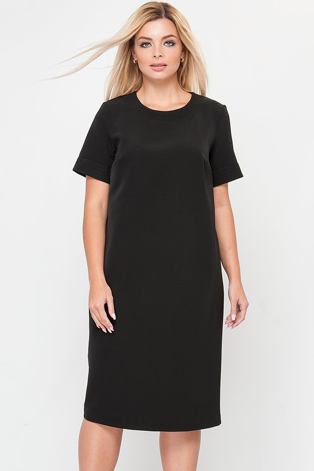 Платье О-образного силуэта, из костюмной ткани однотонной расцветки. По горловине полочки и по низу рукавов отделочные элементы из основной ткани, простроченные 4-мя отделочными строчками. Рукава втачные короткие, по спинке изделия кокетка и разрез по низу. Сзади застежка на декоративную металлическую молнию. Замечательное решение для встреч с друзьями или прогулки в парке.