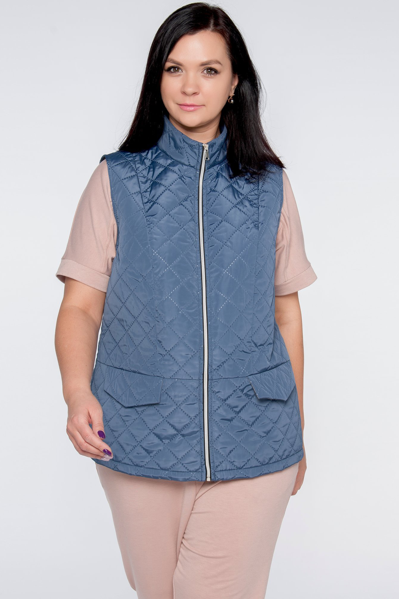Жилет женский прямого силуэта из стеганной ткани с утеплителем из тонкого слайтекса. Модель с воротником стойка и прорезными карманами. Спереди молния.