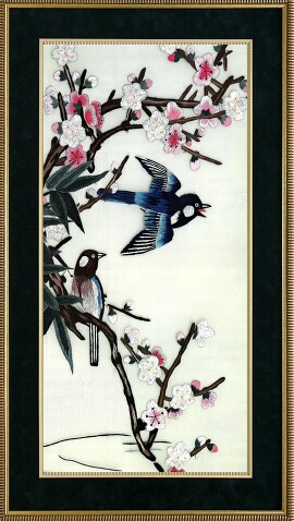 Техника ручной шёлковой вышивки берёт начало в древнем Китае более 2 тысяч лет назад. Благодаря структуре натуральной шёлковой нити, её можно окрасить в несколько тысяч цветовых оттенков. Падающий на картину свет играет, отражается от граней и картина оживает.