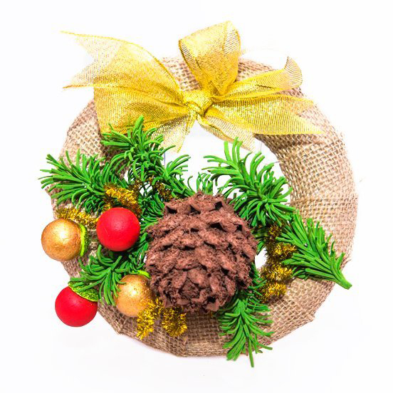 - 1. Пенопластовые шары диаметром 2 см и венок . 2. Гвоздики-булавки. 3. Разноцветные листы FOM EVA и готовая вырубка. 4. Клей. 5. Зубочистки. 6. Проволока 7. Акриловая краска 2-х цветов 8. Мишура. 9. Мешковина. 10. Инструкция с пошаговым описанием и фото. 11. Лента.