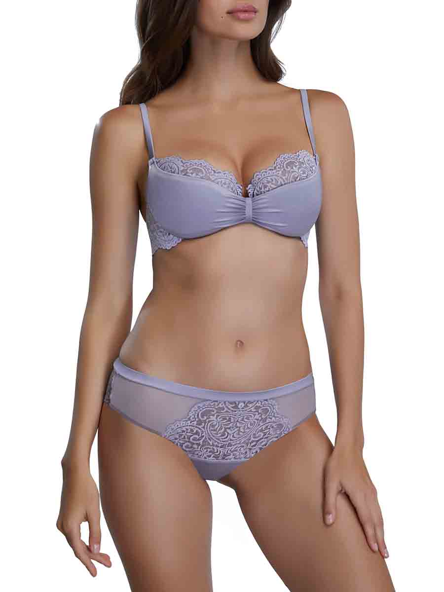 Бюстгальтер с полудублированной поролоновой чашкой накаркасной поддержке. Отделка с эффектом скрытого каркаса. Глубокая линия декольте дублированной части чашки, легкая драпировка по центру. Верхняя часть чашки из эластичного кружева с ажурными краями.