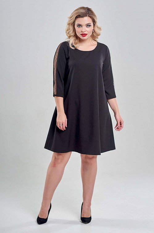 Платье из крепа А-силуэта. Округлый вырез горловины, втачной рукав 3/4 со вставкой по рукаву из сетки в горошек.