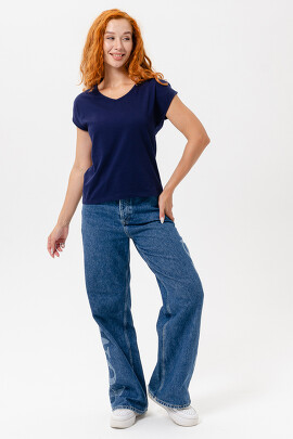Костюм состоит из туники и брюк. Туника с округлой горловиной, свободная. Рукав короткий, с манжетом. Горловина обработана бейкой из основного полотна. Брюки прямые, на поясе, с боковыми карманами, с отделочным лампасом вдоль боковых швов.