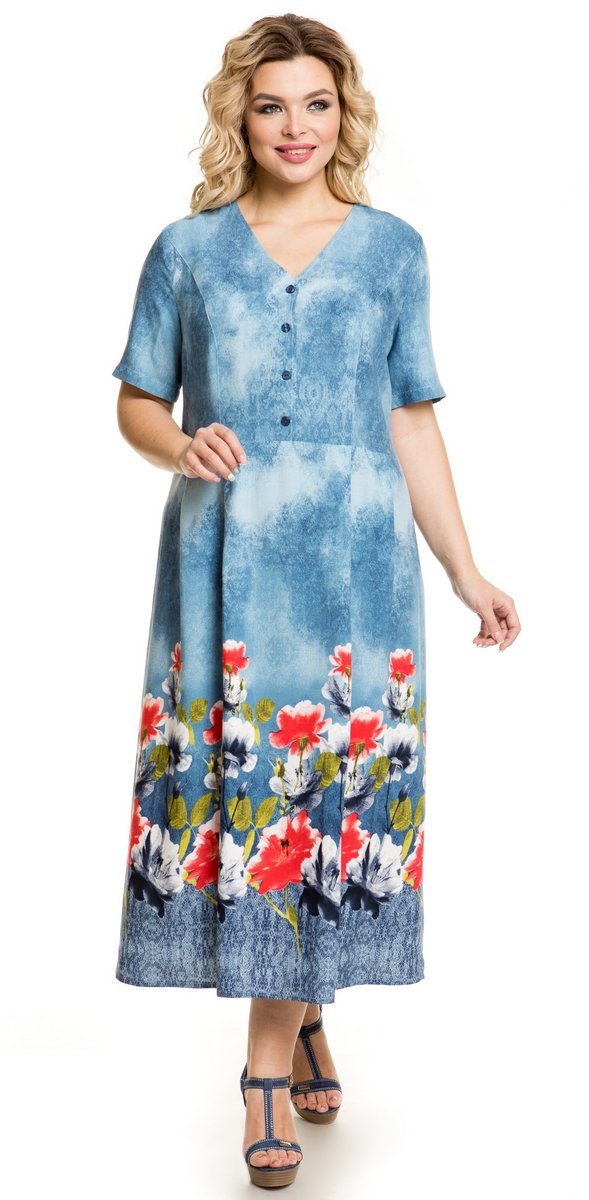 Повседневное платье длиной maxi выполнено из штапельного полотна. Платье отрезное по линии талии. Верх платья по переду и спинке с рельефными швами. По переду с V-образным вырезом и центральной застежкой на петли и пуговицы. Рукав втачной короткий. Длина рукава от плечевой точки в 48 р-ре – 25 см. в 56 р-ре – 26 см., ширина рукава по низу в 48 р-ре – 32 см. в 56 р-ре – 38 см. Низ платья свободный, с мягкими складками по линии шва притачивания талии. В левом боковом шве застежка на потайной замок-молнию длиной 20 см. Платье без подклада. Длина изделия по спинке в 48 р-ре – 122 см. в 56 р-ре – 124 см.
