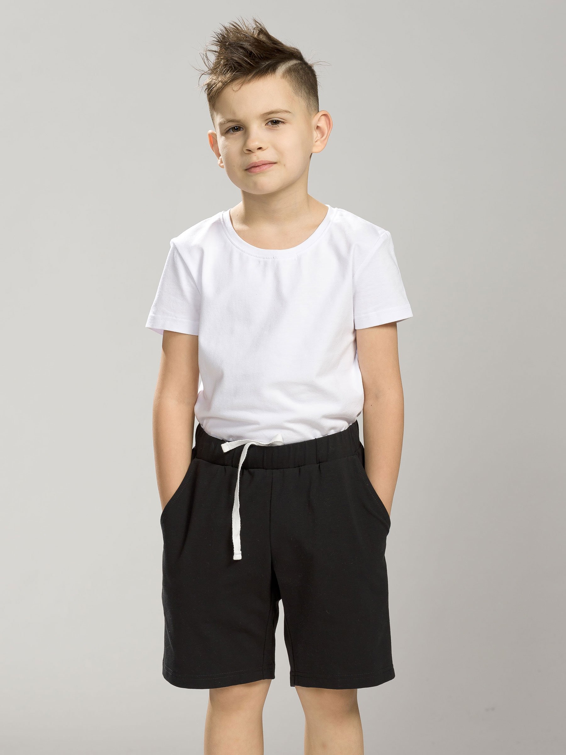 Шорты трикотажные для мальчиков. Длина шорт выше колена. В боковых швах наклонные карманы. Пояс из ткани верха. Для дополнительной регулировки по талии в пояс вставлен эластик и шнурок.