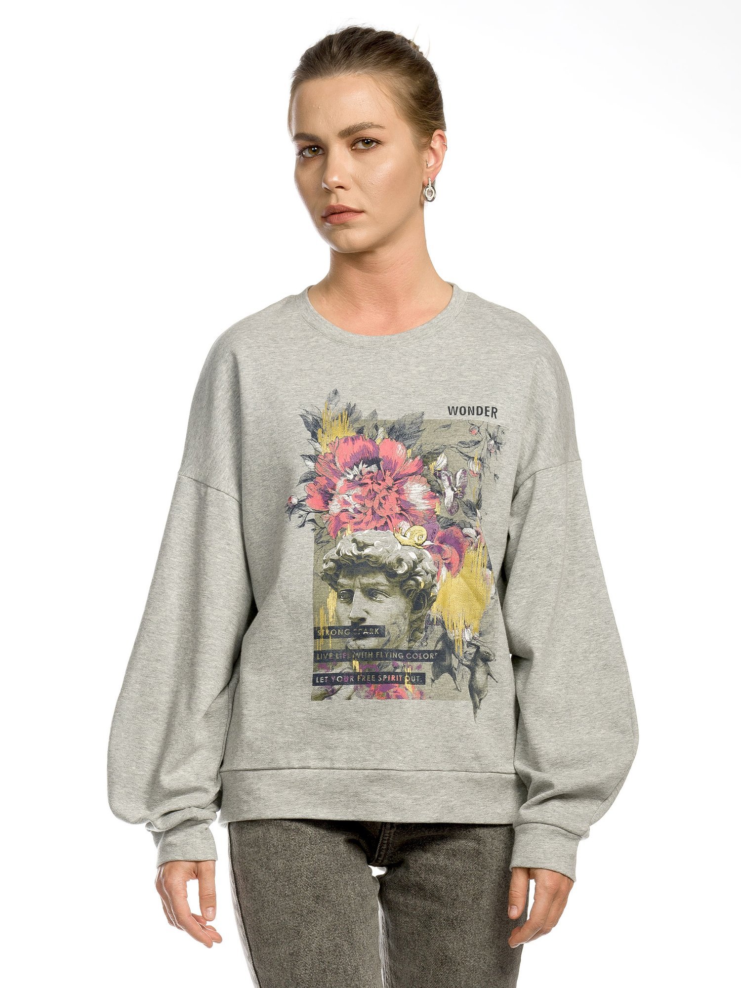 Толстовка женская. Новый по объему свитшот. Уникальный по форме рукав-лепесток. Низ изделия и манжеты — из основной ткани. Спущенная линия плеча. Мягкий стойкий soft-принт с золотой патиной. Перевод: "Чудо. Сильная душа. Проживай жизнь с триумфом. Выпусти свой вольный дух".