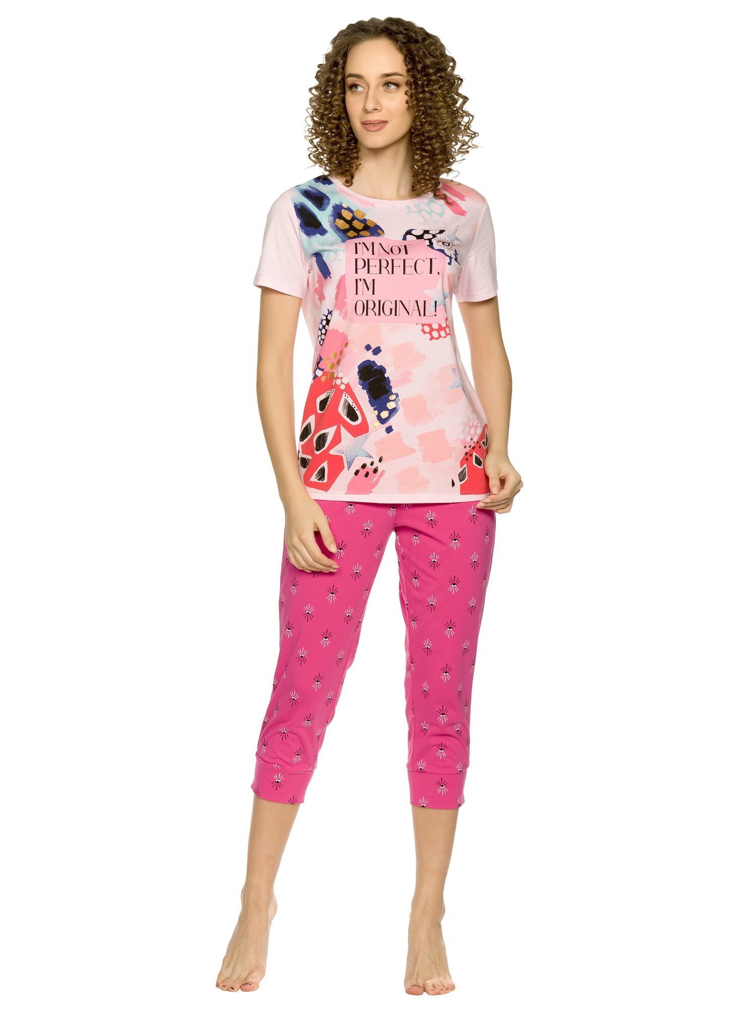 Комплект женский футболка и брюки. Футболка прямого кроя среднего объема. Мягкий стойкий принт с золотым металликом. Перевод Я не идеальная, я оригинальная.. Бриджи комфортного объема. По талии на плоской внутренней резинке, по низу манжеты шириной 7 см., all over принт.