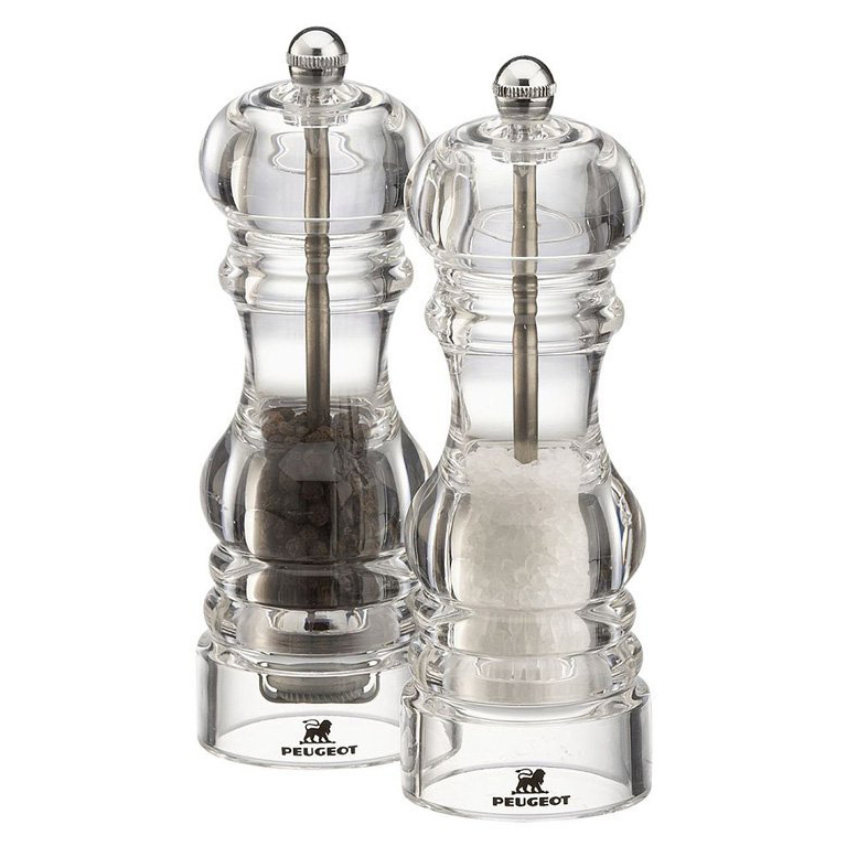 Набор Peugeot "Nancy set" состоит из двух механических мельниц, которые быстро и качественно перемелют любые специи. Изделия выполнены из акрила. Мельницы можно использовать как размельчители для специй, а также как емкости для их хранения. Мельницы могут помолоть все приправы, в том числе перец горошком и крупную морскую соль. Просто откройте крышку сверху, засыпьте необходимое количество специй и крутите крышку, как будто хотите ее открутить. Перемолотые крупинки будут сыпаться с противоположной стороны вашей мельницы. Мельницы уже оснащены небольшим количеством соли и перца. Стильный и практичный набор мельниц Peugeot "Nancy set" станет незаменимым на вашей кухне.Пожизненная гарантия на механизм мельницы , 2 года гарантии на тело мельницы.