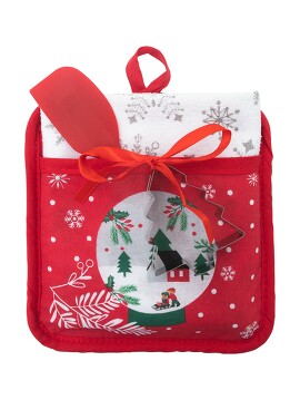 Набор из 4х предметов: - прихватка с карманом, 18*18см, 100% хлопок, верх принтованный рисунок, обратная сторона однотонная, наполнитель поликоттон; - полотенце махровое (велюр), 38*63, 100% хлопок, рисунок-принт; - силиконовая лопатка, 21,4*3,8см; - резак для теста в форме дерева, нержавеющая сталь, 7,7*6см