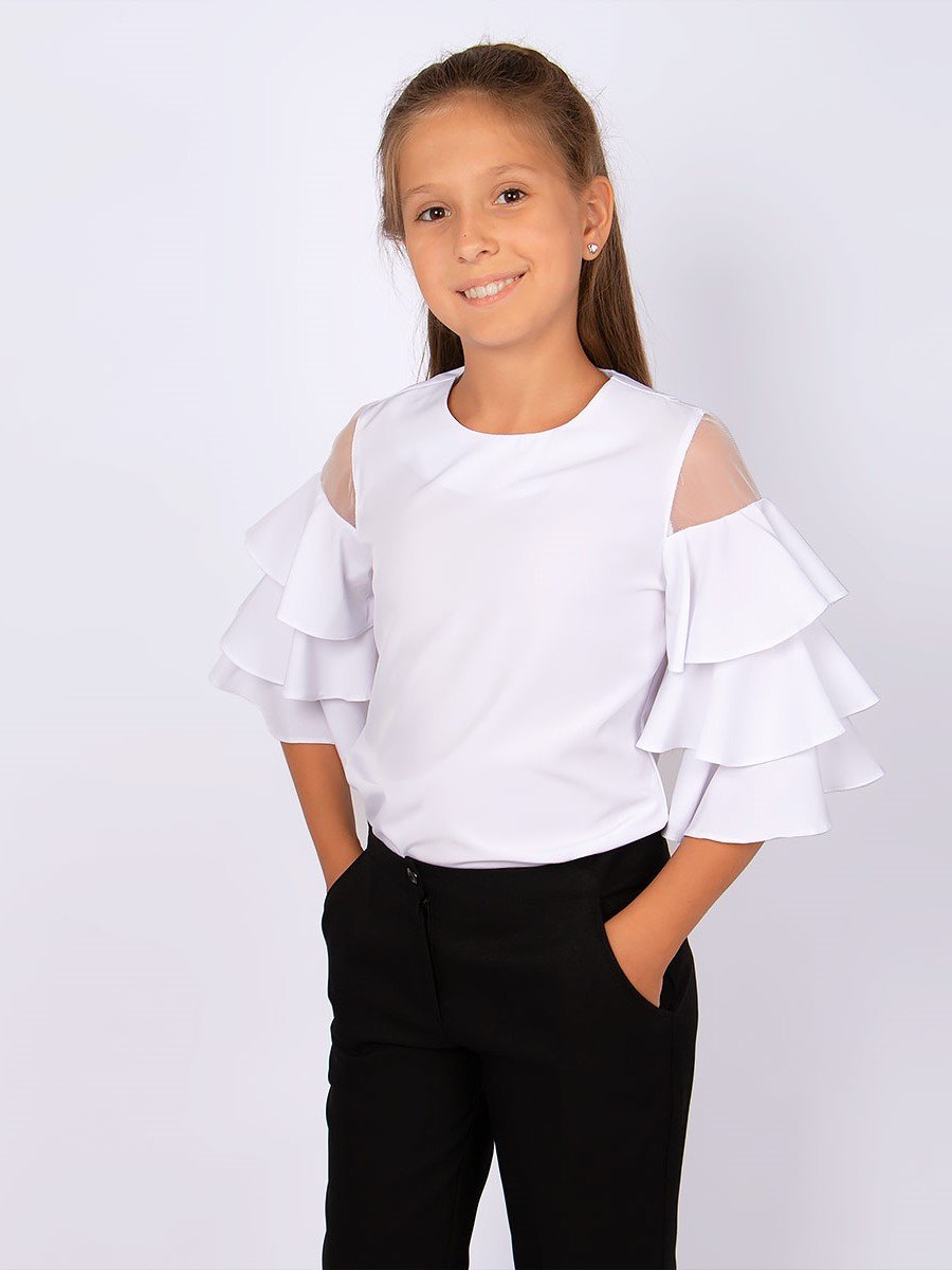 Белая подростковая блузка свободного силуэта. Рукав 3/4 декорирован пышными воланами.