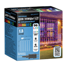 Электрогирлянда Занавес 96 разноцветных LED ламп, прозрачный провод, 6 нитей, 1,5х1,5 м, 8 режимов, с блоком питания Balance