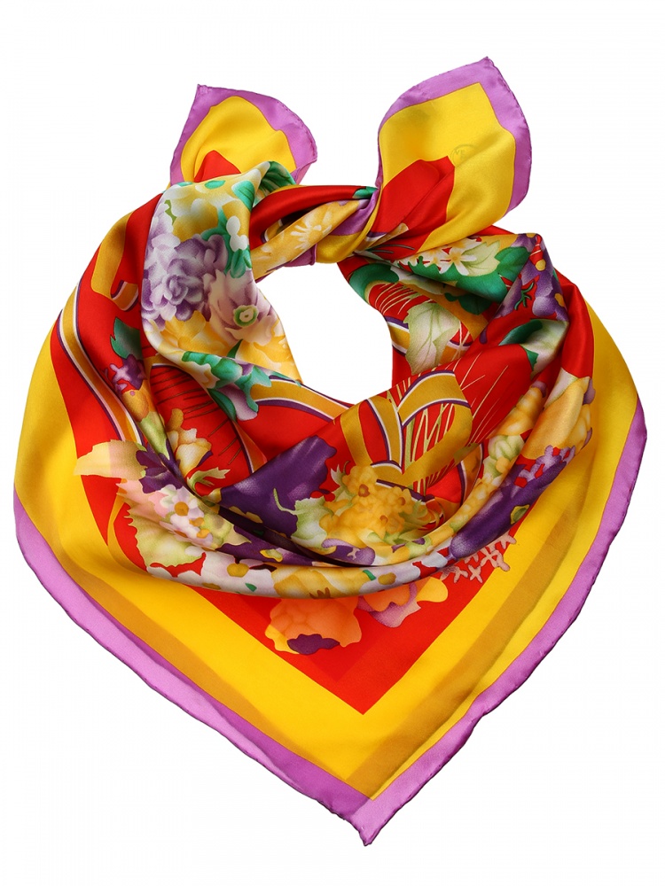 Прекрасный шелковый платок с очаровательным цветочным принтом, яркие и насыщенные тона освежат Ваш образ.
