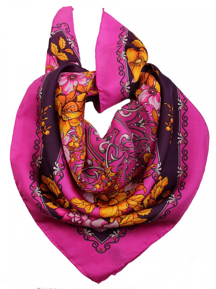 Очаровательный шелковый платок отлично подойдет к любой одежде, яркий цветочный принт придаст Вашему образу игривости и оригинальности. Отличное решения для тех, кто не любит простых однотонных аксессуаров.