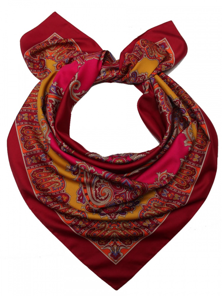 Женский платок оформленный симметричными узорами, выглядит очень ярко и нарядно, красиво дополнит любой образ девушки или женщины.